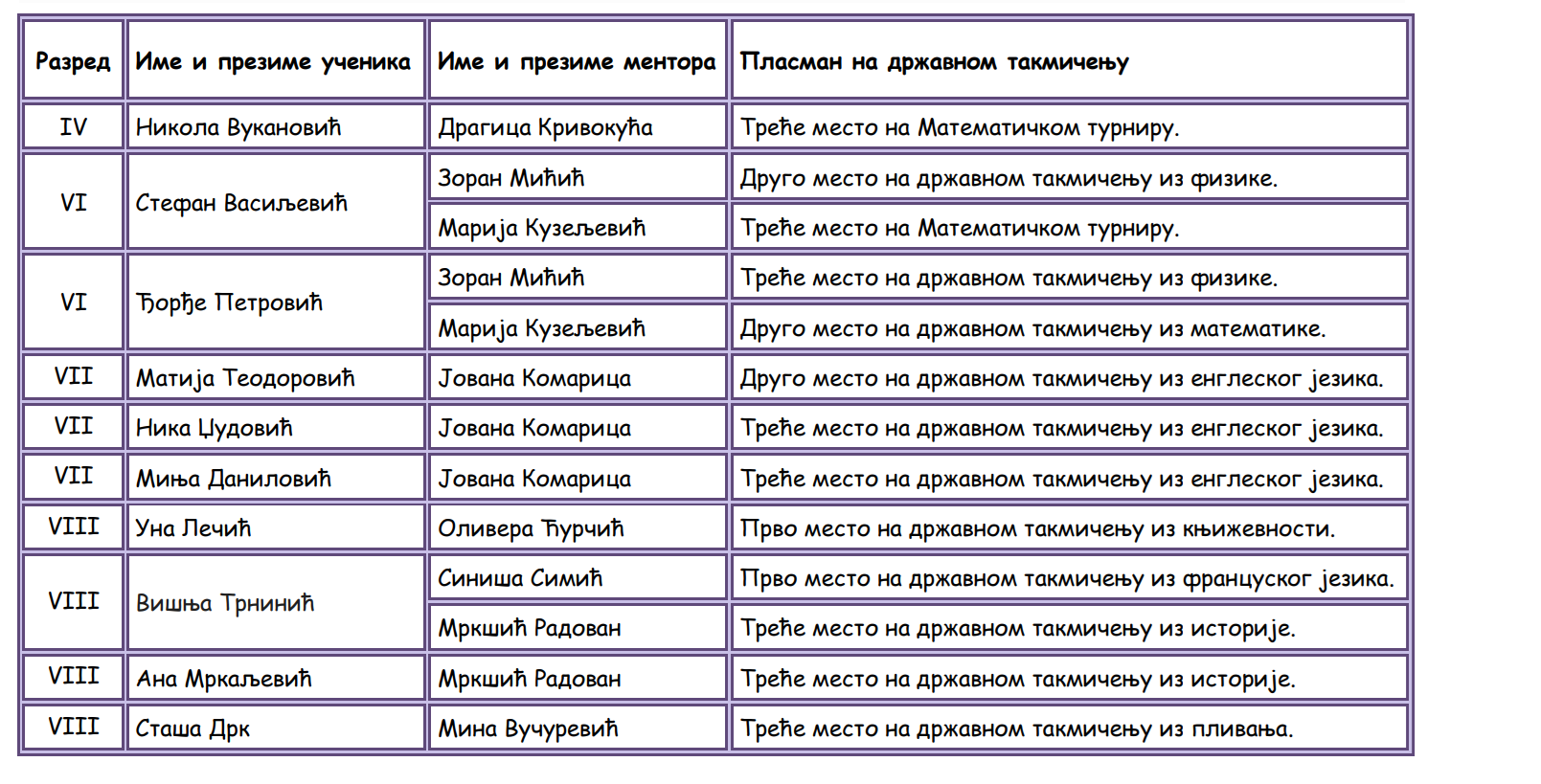 У четвртак 13. 6. 2024. у нашој школи уручене су похвалнице за 80 ученика и 30 ментора који су постигли изузетан успех на различитим нивоима такмичења. Посебно желимо да похвалимо 10 ученика који су заузели једно од прва три места на државним такмичењима. Њихови ментори такође заслужују велику похвалу за своју подршку, вођство и инспирацију коју су пружили ученицима.