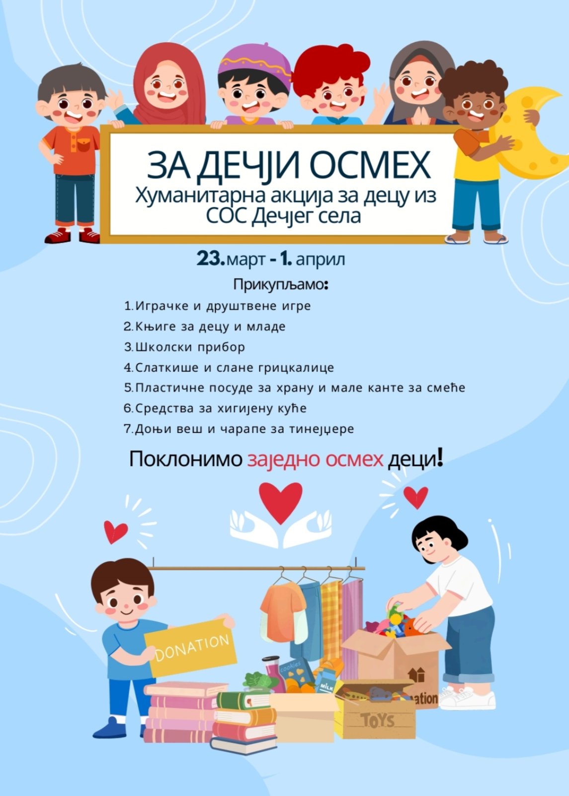 у нашој школи организујемо хуманитарну акцију "За дечији осмех", са жељом да помогнемо деци која одрастају у СОС Дечијем селу.