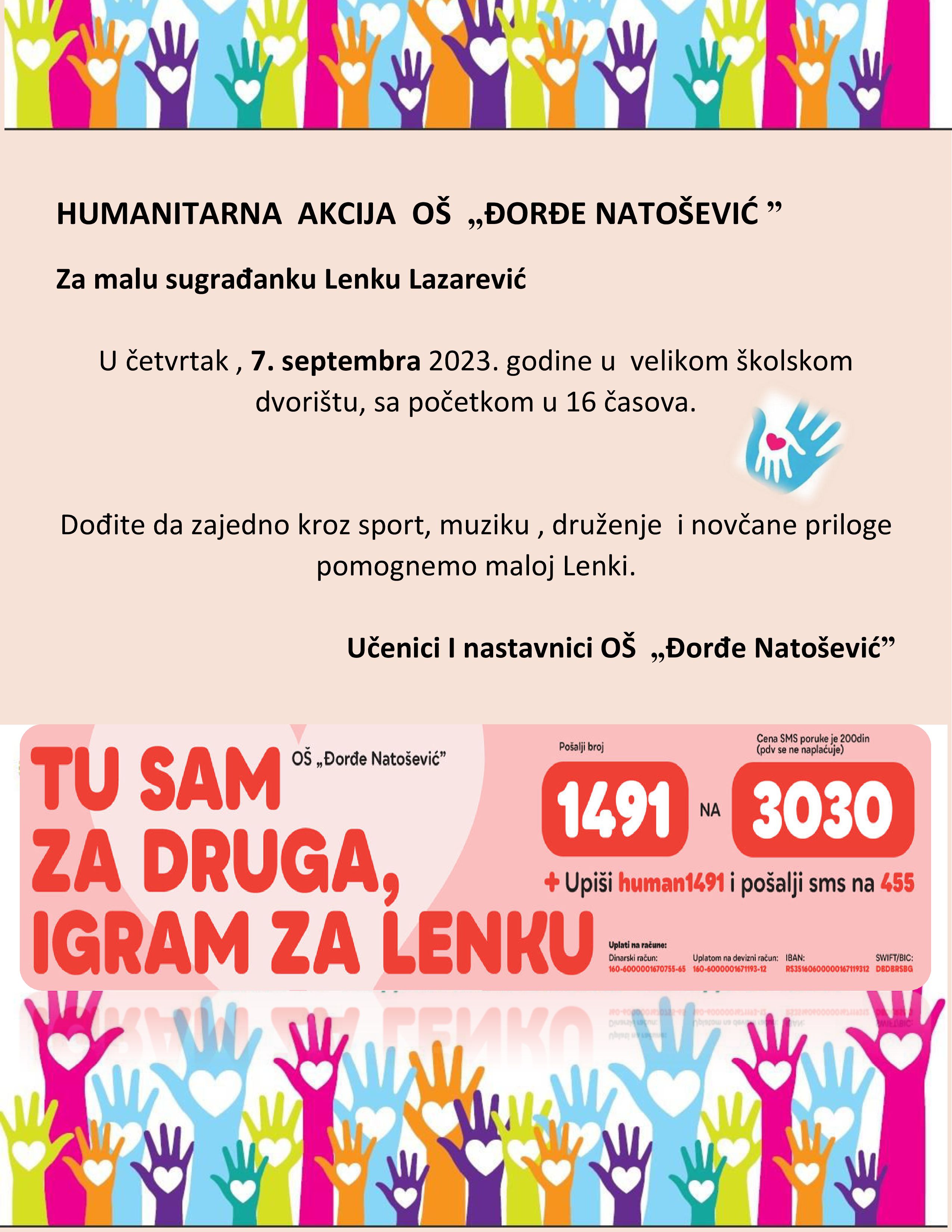 У четвртак, 7.9.2023. године у нашој школи одржана је хуманитарна акција и манифестација која је понела назив ,,Ту сам за друга, играм за Ленку'' и која је за циљ имала прикупљање новчаних прилога као помоћ у лечењу мале суграђанке, Ленке Лазаревић.